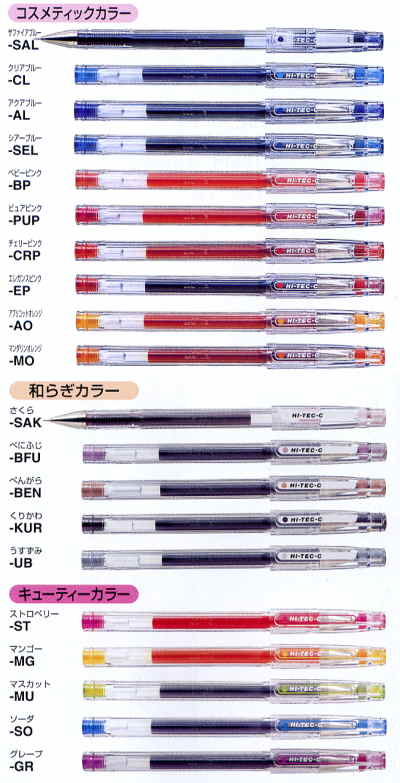 | カラー | ブラック、レッド、ブルー、グリーン、ブルーブラック、ピンク、イエロー、オレンジ、バイオレット、ライトブルー、ブラウン、アップルグリーン、カメリア、クリアブルー、アクアブルー、ベビーピンク、ピュアピンク、チェリーピンク、エレガンスピンク、アプリコットオレンジ、マンダリンオレンジ、さくら、べにふじ、べんがら、くりかわ、うすずみ、ストロベリー、マンゴー、マスカット、ソーダ、グレープ |